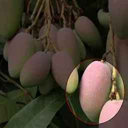 椰香芒又名“鸡旦芒”,台湾名“大益利”,原产印度,在海南省西南部栽培较早结果和丰产。其嫁接树植后3-4年结果,6龄树亩产可达500-600公斤。5-7月成熟,果实卵形或长卵形,平均单果重120-150克,水肥充足者达200克。成熟时果皮黄绿色,果肉橙黄色或橙红色,肉质结实、细腻,纤维极少,味甜,有椰乳香气。种子单胚,果皮厚,较抗果实蝇为害。在光照充足环境下较高产,但在丰年加施肥、修剪不及时植株易衰竭,导致次年减产或失收。该品种易感染白粉病与流胶病。