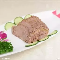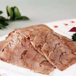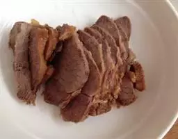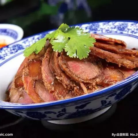 1.将牛后腿肉洗净,切成两块,放在冷水里浸泡1小时后捞起,放在汤锅中,加清汤、葱段、姜块、花椒、黄酒,上火烧沸,撇去浮沫,转小火上煮3小时,待牛肉九成烂时,捞出控去汤,晾凉。