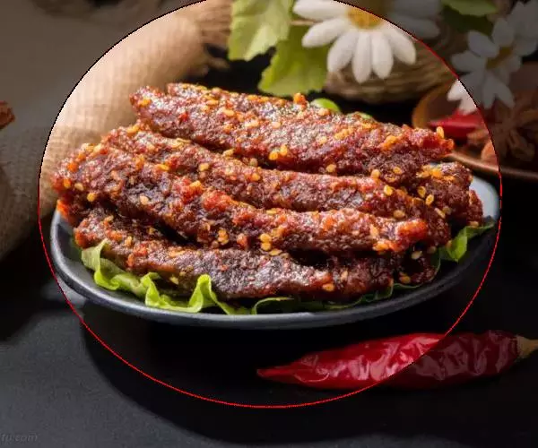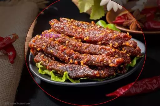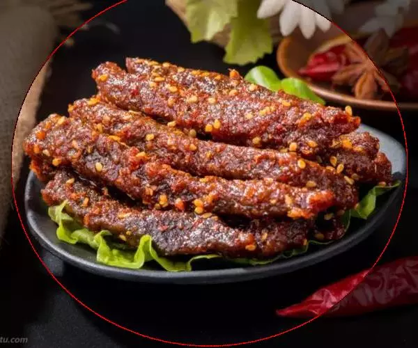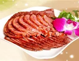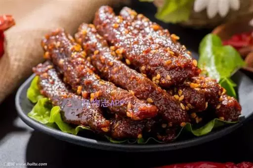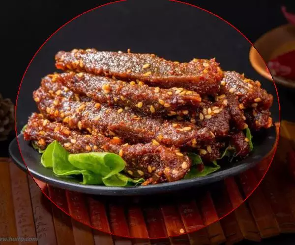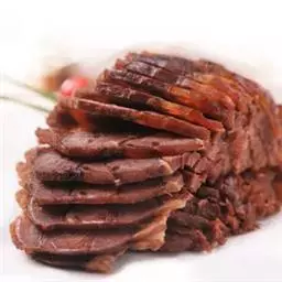 3.将香油注入锅中,上火烧至七成热,下入干辣椒炸焦,再放入葱段、姜段桂皮、花椒略炸一下,随即注入清汤,加入料酒、精盐、白糖、酱油,再倒入炸好的牛肉片,在微火上将汁靠浓。待汁快靠完时,倒入盆中晾凉,将牛肉挑出码在圆盘内,上面码上用燕窝做成的“吉”字即成。
