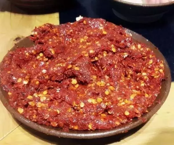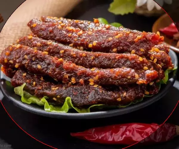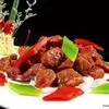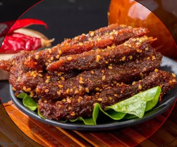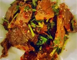 4.锅底留油25克,烧糊花椒捞出不要,再炸干辣椒成紫黑色,加葱、姜炒一下,注入汤150毫升,加酱油、糖及余下料酒,放入牛肉上火收汁,汁快尽时加入味精,汁干时加入辣椒油,撒上芝麻,翻匀即成,食时挑去辣椒装盘。