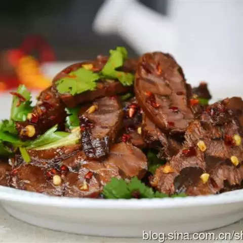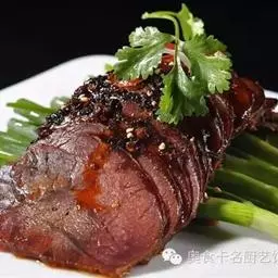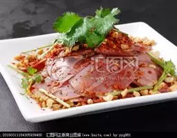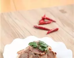 3、将煮熟的牛肉切成长方形薄片,码在盘中,浇上麻辣汁,撒上熟芝麻仁与葱末,吃时拌匀即成。