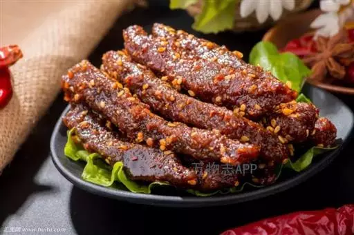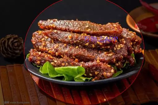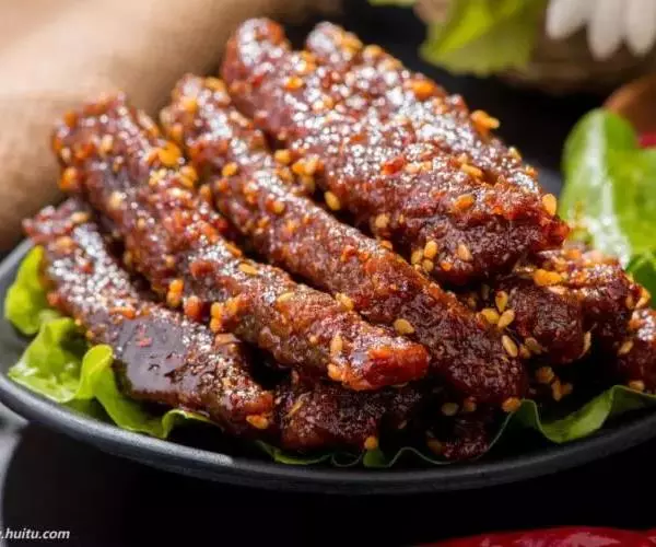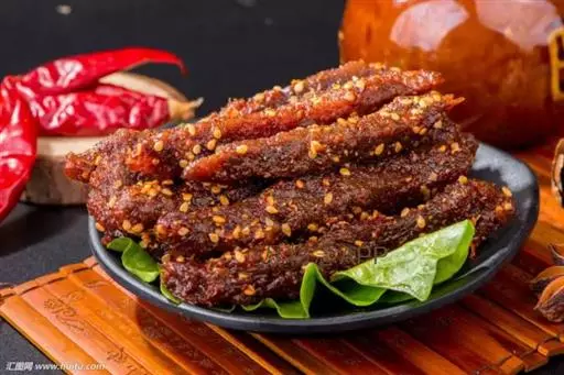 4、锅内放豆油75克,烧热,放入花椒,炸糊后捞出,弃之。油稍凉一些,放入干红辣椒炸成紫黑色时,加入葱、姜炒一下,放入牛肉汤,加酱油、味精、牛肉条,用中等火力将汁收浓,汁尽时浇上辣椒油,撒上焙好的芝麻。