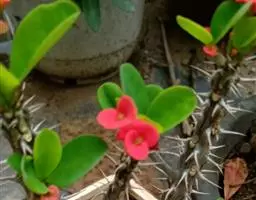 虎刺梅:别称铁海棠,是蔓生灌木植物。茎多分枝,长60-100厘米,直径5-10毫米,具纵棱,密生硬…