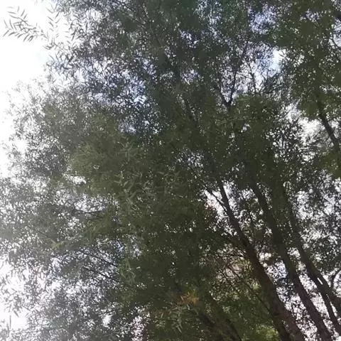 爆竹柳为乔木,高达20米,胸径可达100厘米。树冠圆形或长圆形,树皮暗黑色,有沟裂;小枝淡褐绿色,较粗壮,无毛,有光泽,萌枝初有短柔毛。