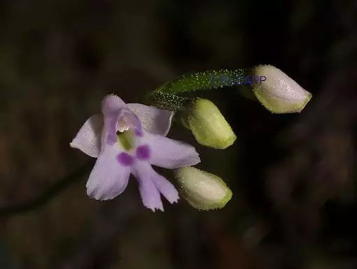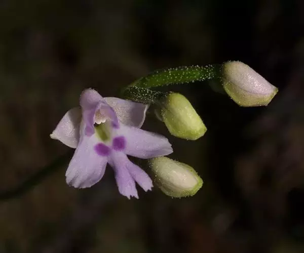 植株高7-30厘米。块茎卵形或长圆状椭圆形,长1-2.5厘米,直径约1厘米,肉质。茎纤细,直立或近直立,光滑,基部具1-2枚筒状鞘,近基部具1枚大叶,在叶之上具1-2枚苞片状小叶。叶片狭长圆形、长圆形、椭圆状长圆形或卵状披针形,直立伸展,长5-12厘米,宽1-3.5厘米,先端钝或急尖,基部收狭成抱茎的鞘。总状花序具5至20余朵花,偏向一侧;花苞片小,直立伸展,卵状披针形或卵形,先端渐尖,较子房短很多;子房圆柱形,稍扭转,无毛,连花梗长7-10毫米;花小,粉红色或紫红色;中萼片直立,卵形,长2.5-3毫米,宽1.5-2毫米,凹陷,舟状,先端钝,具1脉;侧萼片斜卵形或基部渐狭呈倒卵形,长3毫米,宽约2毫米,先端钝,具1脉;花瓣斜椭圆形或卵形,长2.5-3毫米,宽约2毫米,先端急尖,具1脉;唇瓣较萼片和花瓣大,轮廓为倒卵形,长3.5-5(-7)毫米,具5-7(-9)不隆起的细脉,基部楔形,具距,中部之上3裂,侧裂片镰状线形、长圆形或三角形,先端钝或截形,中裂片较侧裂片大,倒卵状楔形,先端截形、圆形或圆形而具短小或中间凹缺;距纤细,圆筒状,几乎直的,下垂,长2-3(-5)毫米,较子房短多,末端钝;蕊柱极短,直立;花药稍向后倾,先端稍凹陷,药室并行;花粉团卵球形,具花粉团柄和粘盘,粘盘小,椭圆形;蕊喙小,直立,三角形;柱头2个,隆起,近棒状,从蕊喙之下伸出;退化雄蕊2个,小,椭圆形。花期6-7月。果期9-10月。