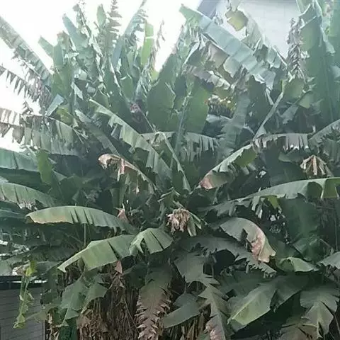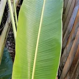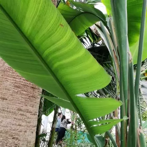 红蕉,假茎高1-2米。叶片长圆形,长1.8-2.2米,宽68-80厘米,叶面黄绿色,叶背淡黄绿色,…