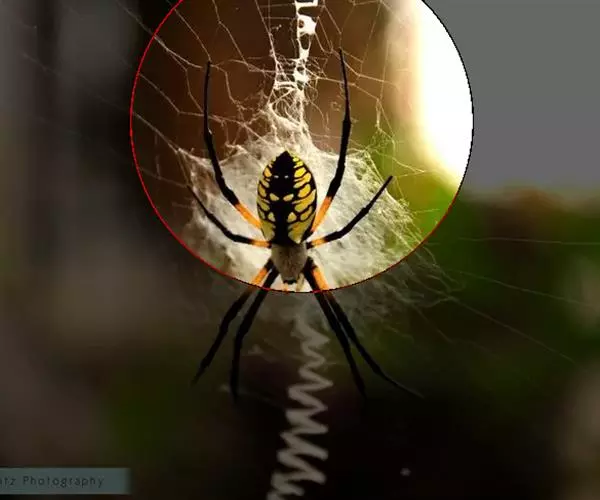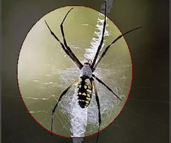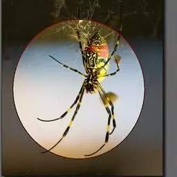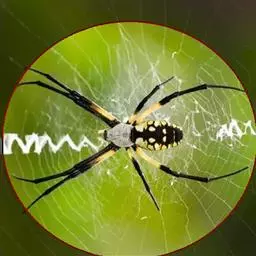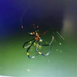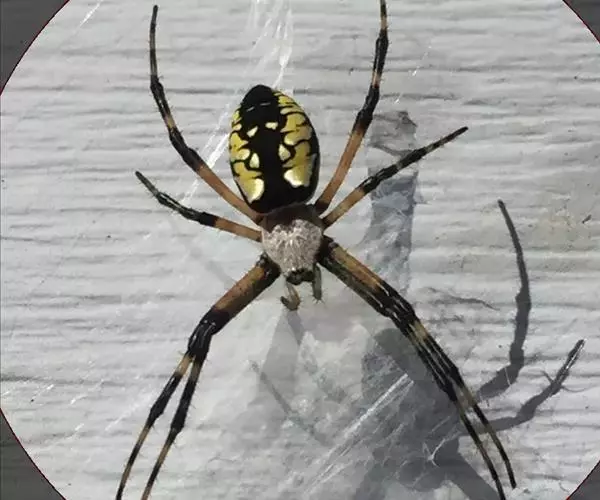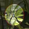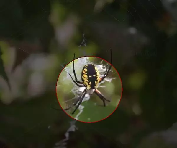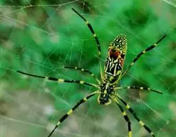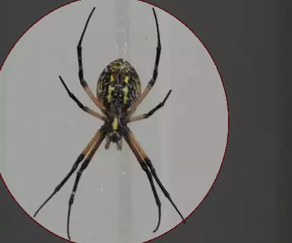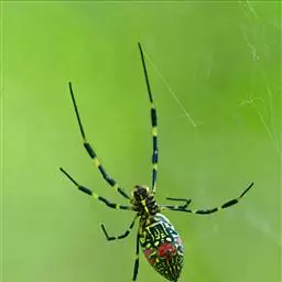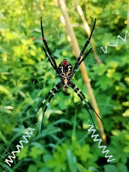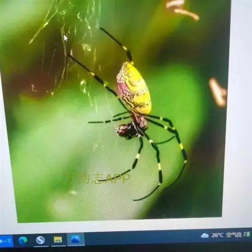 雌蛛体长20~25毫米。背甲黑褐色,密生灰色绒毛。头部隆起,中间有一褐色“V”形斑,颈沟凹陷,中窝横向。螯肢棕黑色。触肢黄色多小黑刺,.跗节末端黑色。胸板棕黑色,密被细长毛,中央有黄白色宽条纹。步足黑色,多黑毛和长刺。腿、胫与后跗节上有黄色轮纹。腹部圆筒形,腹背黄色底,有青绿色横带相间,腹侧有黄色与黑色斜纹相间,腹末端色深,有黄色圆斑。腹面中央有一棕褐色横列“E”字斑。纺器棕黑色,成熟雌体纺器周围有一鲜红色大斑纹,非常艳丽。