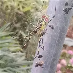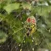 棒络新妇,学名:Nephila clavata L. Koch, 1878,属蛛形纲蜘蛛目园蛛科,在山区林间、灌丛间结网,果园以及庭院也常见到。卵袋附于叶的表面和枝干上,毒性很小。