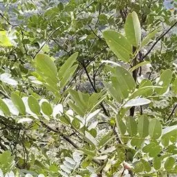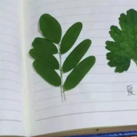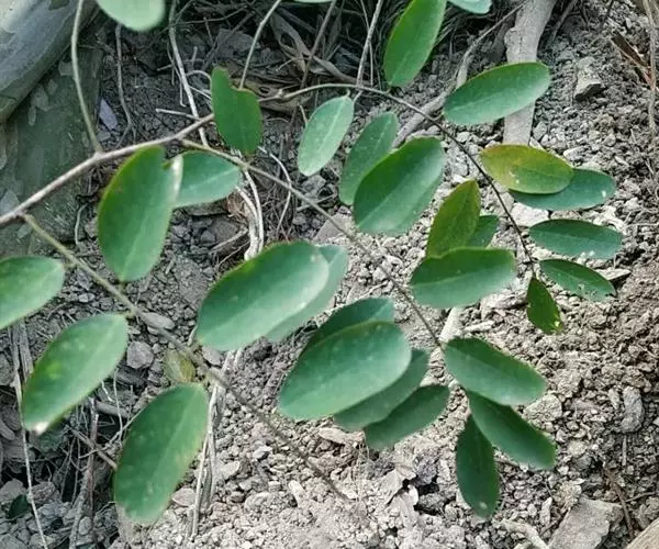 羽状复叶长15-25厘米;小叶3-5对,近革质,椭圆形至长圆状椭圆形,长3.5-6厘米,宽2.5-4厘米,先端钝.或稍凹入,基部圆形或阔楔形,两面无毛,细脉隆起,上面有光泽。
