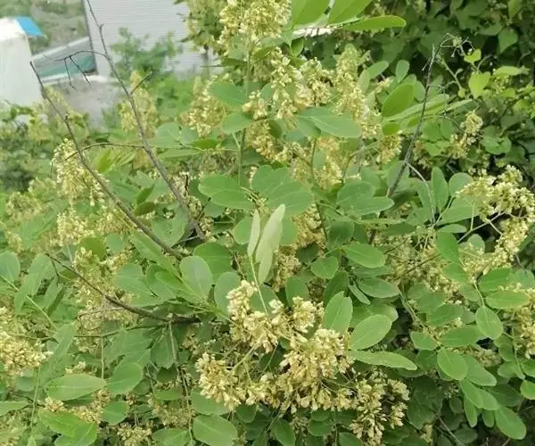 圆锥花序顶生或生于最上部的叶腋间,连总花梗长15-20厘米,径10-20厘米,疏被锈色短柔毛;花密集,长6-7毫米;花梗长约5毫米,与花萼同疏被锈色柔毛;基生和副萼状小苞片卵形,被柔毛,脱落;花萼钟状,长2-3毫米,萼齿5,上方2枚阔圆形,近合生,侧方的卵形,最下一枚披针形,长为其余4枚之倍;花冠白色或淡紫色,长倍于花萼,各瓣均具柄,旗瓣圆形,先端微缺,翼瓣倒卵形,龙骨瓣关月形,与翼瓣内侧均具耳;雄蕊10,成5+5的二体;子房具短柄,除基部与子房柄外,无毛,胚珠2-3粒,花柱纤细,柱头小,头状。荚果长圆形或阔舌状,长4-7厘米,宽13-15毫米,顶端急尖,基部渐狭成果颈,果瓣薄革质,对种子部分有网纹,有1-2 (-3)粒种子;种子肾形,长7-14毫米,宽5-9毫米。花期5-7月。