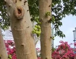 榕果簇生于老干发出的瘤状枝上,近球形,直径1.5-2厘米,光滑,成熟桔红色,不开裂,总梗长8-24毫米,雄花和瘿花生于同一榕果内壁;雄花,生于其近口部,少数,具短柄,花被片3-4,雄蕊1枚,花丝短;瘿花,具柄,花被片极短或不存,子房光滑,倒卵形,花柱近侧生,纤细,柱头膨大;雌花,生于另一植株榕果内,花被管状,围绕果柄下部。瘦果近斜方形,表面有小瘤体,花柱长,棒状。花期5-7月。