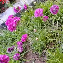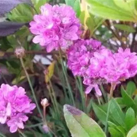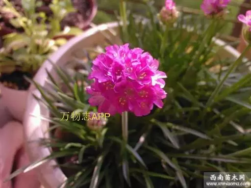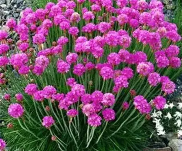 蓝雪科矾松属宿根草花,植株低矮,丛生状,株高20-30厘米。叶基生,叶线状长剑形, 海石竹 花为粉红色至玫瑰红色,全缘、深绿色;春季开花,头状花序顶生。花茎细长,小花聚生于花茎顶端。呈半圆球形,紫红色,花茎约3厘米。