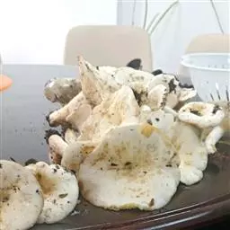 凤尾菇:子实体大型,8~25厘米,多10厘米以上,菌盖棕褐色,上常有放射状细纹,成熟时边缘呈波状弯曲,菌肉白色、柔软而细嫩,菌盖厚,常可达1.8厘米甚至更多。枞生或散生,或单生。菌柄短粗且柔软,一般长1.5~4.0厘米,粗1~1.8厘米。
