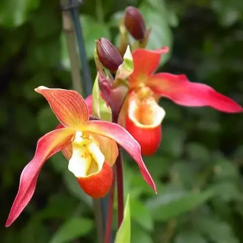 花葶长14-18厘米,无毛,被2-4枚膜质筒状鞘;总状花序长4-7厘米,疏生4-7朵花;花苞片卵状披针形,比花梗和子房短,长1.1-1.6厘米,先端渐尖;花中等大;萼片和花瓣绿色;中萼片长圆状披针形,长约1厘米,宽约2.5毫米,先端渐尖,具5条脉;侧萼片多少镰刀状长圆形,等长于中萼片而较宽,先端渐尖,基部贴生在蕊柱足上,具5条脉。