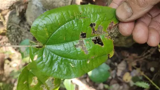 危害症状:木撩尺蠖(造桥虫)幼虫咬食叶片,仅留叶脉,造成枝条光秃,使树势生长减弱,当年结果少,第2年也不能结果。其虫卵产在山茱萸树枝分叉下部的树皮缝内。
