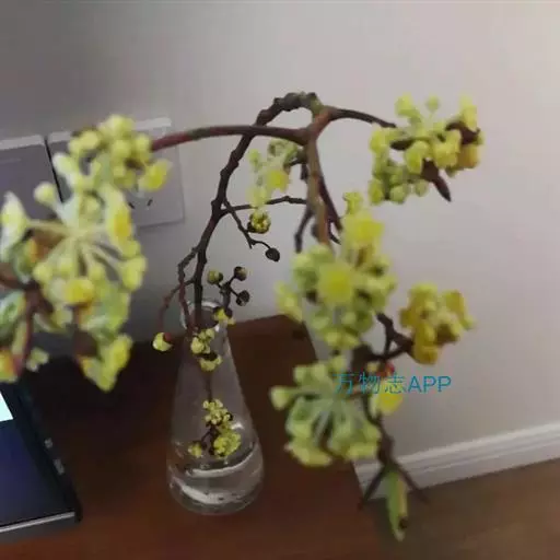 伞形花序生于枝侧,有总苞片4,卵形,厚纸质至革质,长约8毫米,带紫色,两侧略被短柔毛,开花后脱落;总花梗粗壮,长约2毫米,微被灰色短柔毛;花小,两性,先叶开放;花萼裂片4,阔三角形,与花盘等长或稍长,长约0.6毫米,无毛;花瓣4,舌状披针形,长3.3毫米,黄色,向外反卷;雄蕊4,与花瓣互生,长1.8毫米,花丝钻形,花药椭圆形,2室;花盘垫状,无毛;子房下位,花托倒卵形,长约1毫米,密被贴生疏柔毛,花柱圆柱形,长1.5毫米,柱头截形;花梗纤细,长0.5-1厘米,密被疏柔毛。