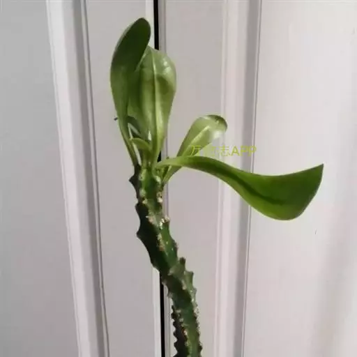 叶互生,少而稀疏,肉质,常呈五列生于嫩枝顶端脊上,倒卵形、倒卵状长圆形至匙形,长4.5-12厘米,宽1.3-3.8厘米,顶端钝圆,具小凸尖,基部渐狭,全缘;叶脉不明显;叫柄短,长2-4毫米;托叶刺状,长2-3毫米,宿存。