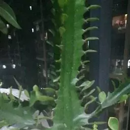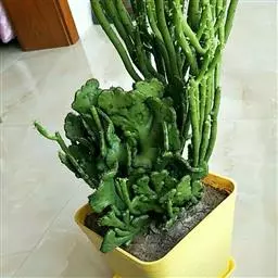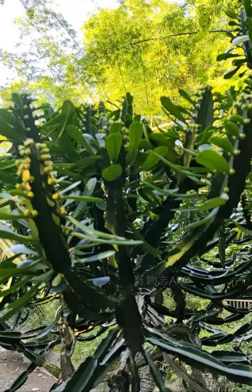 金刚纂(学名:Euphorbia neriifolia L.)是大戟科,大戟属肉质灌木状小乔木,乳汁丰富。茎圆柱状,上部多分枝,高可达8米,叶片互生,少而稀疏,肉质,生于嫩枝顶端脊上,顶端钝圆,基部渐狭,叶脉不明显;托叶刺状,宿存。花序二歧状腋生,苞叶膜质,总苞阔钟状,裂片半圆形,边缘具缘毛,雄花多枚;苞片丝状;6-9月开花。