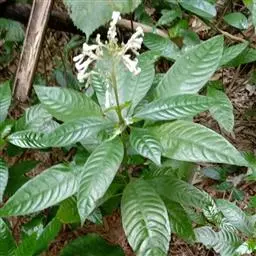 日本蛇根草,草本,高20-40厘米或过之;茎下部匐地生根,上部直立,近圆柱状,上部干时稍压扁,有二列柔毛。叶片纸质,卵形,椭圆状卵形或披针形,有时狭披针形。