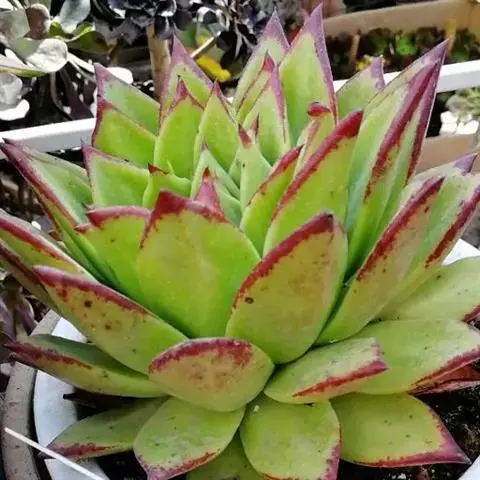 大和锦是景天科拟石莲花属的多肉植物。肉质叶排成紧密的莲座状,广卵形至散三角卵形,背面突起呈龙骨状,…