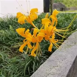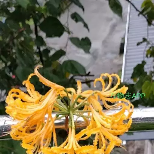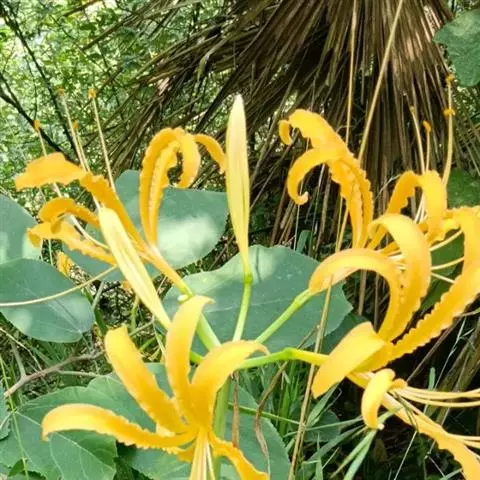 忽地笑(学名:Lycoris aurea (L'Hér.) Herb)草本,地生。鳞茎卵形;叶剑形;伞形花序,有花4-8朵,花黄色;花被裂片背面具淡绿色中肋,雄蕊略伸出于花被外,花丝黄色;蒴果具三棱,室背开裂;种子少数,近球形。