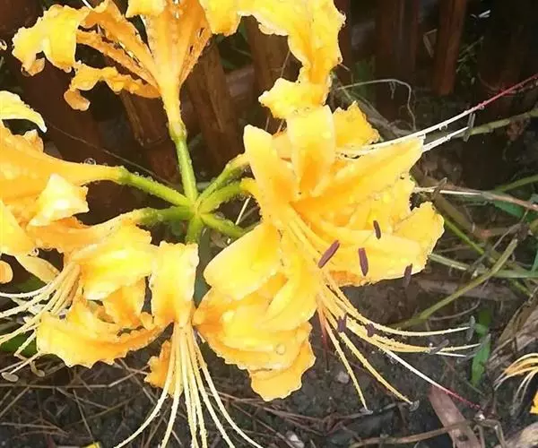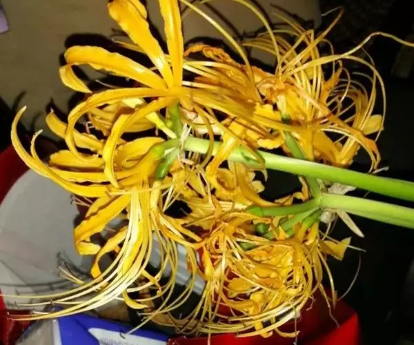 花茎高约60厘米;总苞片2枚,披针形,长约3.5 厘米,宽约0.8厘米;伞形花序有花4-8朵;花黄色;花被裂片背面具淡绿色中肋,倒披针形,长约 6厘米,宽约1厘米,强度反卷和皱缩,花被筒长1.2-1.5厘米;雄蕊略伸出于花被外,比花被长1/6左右,花丝黄色;花柱上部玫瑰红色。