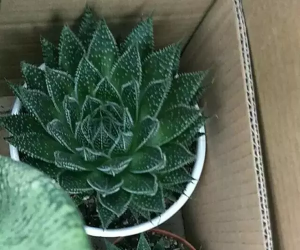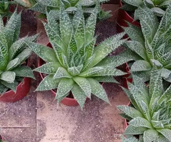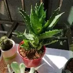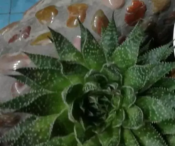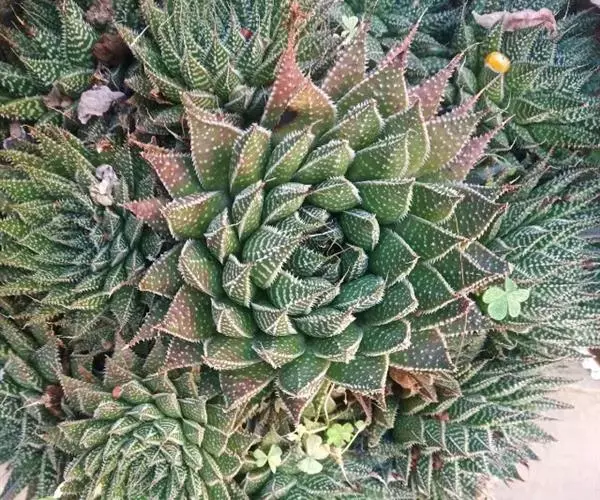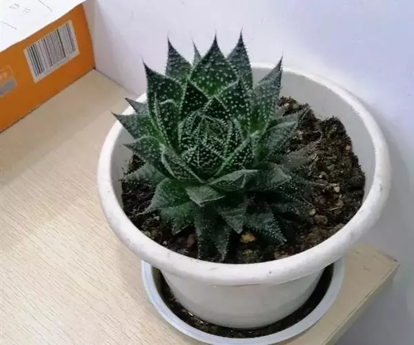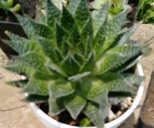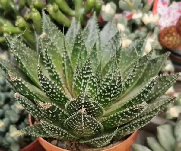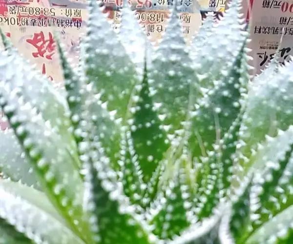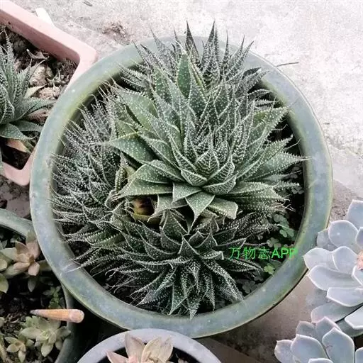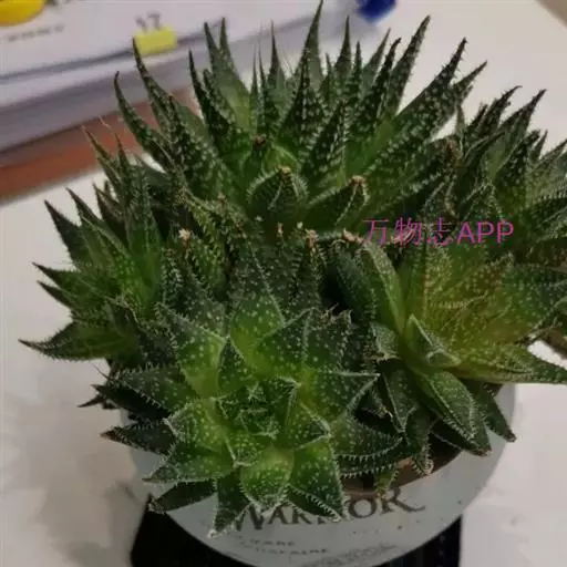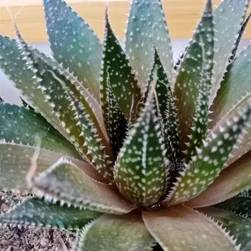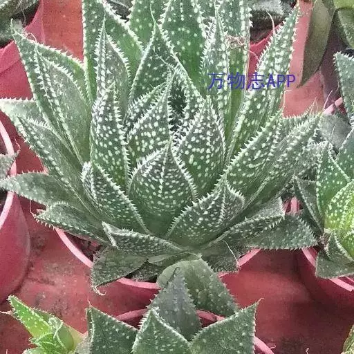 绫锦(学名Aloe aristata ),百合科芦荟属多年生肉质草本,株高可达12厘米,叶片呈莲座状,叶上有小白色斑点和白色软刺,叶缘具细锯齿,深绿色。