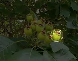 果圆柱状,长1.7厘米,直径1厘米,幼时被绒毛,成熟时秃净,有斑点。盛花期5月中旬一下旬。