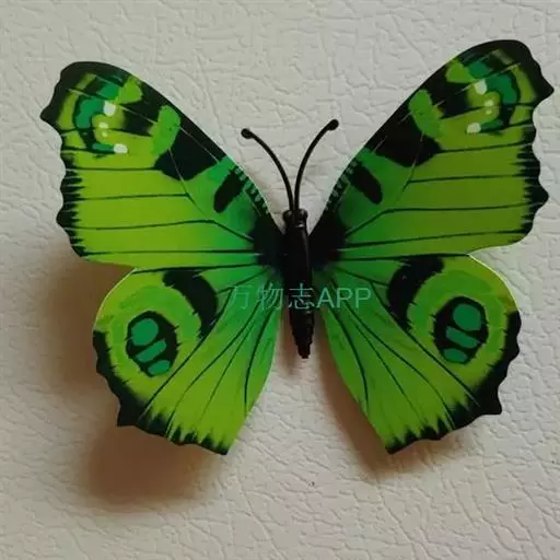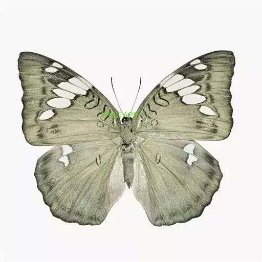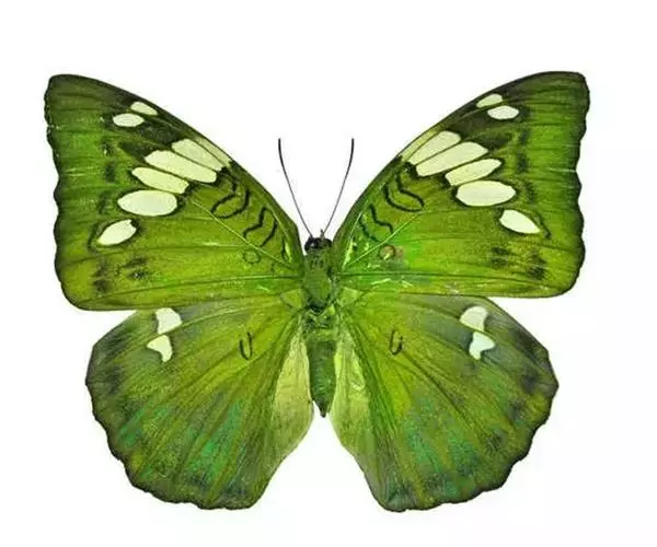 珀翠蛱蝶 两翅墨绿色,前翅中室内有深色横纹,中室外及近顶角处有数个白斑,后翅亚外缘有一列暗绿色箭形斑,外缘有白边,幼虫寄主未明。