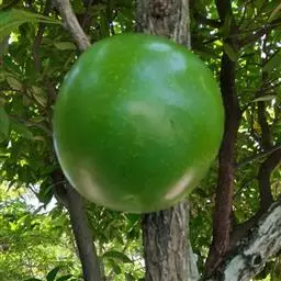 它的名字似乎带着浓烈的火药味,其实炮弹果是著名的热带观果植物,这种奇异的果实生长速度很快,小小的幼果不出几天直径就能达20多厘米。观果期长,果实外观青绿光亮,又像西瓜,又像葫芦,让人误以为是一种美味的热带水果,其实它只是好看而不能食用的,果肉粘稠状,有异味,口感不良。