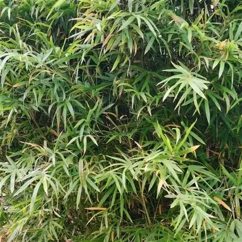 凤尾竹 Raeusch. ex Schult. ’Fernleaf’ R. A. Young)是禾本科,簕竹属孝顺竹的变种。植株较高大,杆高可达6米,竿中空,小枝稍下弯,下部挺直,绿色;竿壁稍薄;节处稍隆起,无毛;叶鞘无毛,纵肋稍隆起,背部具脊;叶耳肾形,边缘具波曲状细长繸毛;叶舌圆拱形,叶片线形,上表面无毛,下表面粉绿而密被短柔毛,小穗含小花,中间小花为两性;外稃两侧稍不对称,长圆状披针形,先端急尖;内稃线形,脊上被短纤毛,花药紫色,子房卵球形,羽毛状。成熟颖果未见。原产中国,华东、华南、西南以至台湾、香港均有栽培。凤尾竹喜温暖、湿润和阳光充足的环境,耐寒。宜土层深厚、肥沃、疏松的微酸性壤土。该种观赏价值较高,宜作庭院丛栽,也可作盆景植物。全草或根入药,味淡、微苦,性寒,有清热利湿、凉血止血、消肿解毒功效,可治痢疾、泄泻等多种病症。凤尾
