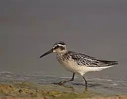 阔嘴鹬是涉禽,体长17厘米。特征为翼角常具明显的黑色块斑并具双眉纹。与黑腹滨鹬平滑下弯的嘴相比,…