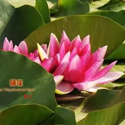 红花睡莲,多年生浮水植物。叶浮于水面,卵形,革质,表面绿色,背面紫红色,幼叶红色,花昼开夜合,浮于水面挺出水面,中午开得最大,半夜闭合,故名“子午莲”,花瓣多数,花红色,花期7—8月。原产欧洲及北非。喜温暖,也能耐寒,喜欢水质清洁,水面通风好且肥沃的黏质土壤。为著名的水生花卉,花姿娇艳,有较高的观赏价值。