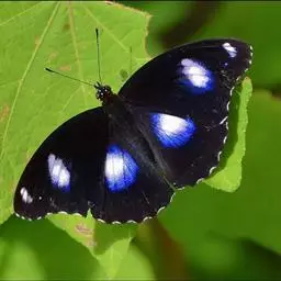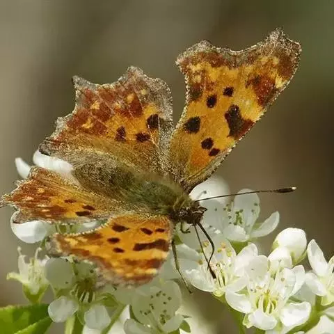 与白钩蛱蝶(P.c-album)相似又混合发生,主要区别是:前翅中室内有3个黑褐斑;后翅中室基部有1个黑点;前翅后角和后翅m2、cu1、cu2室外端的黑斑上有蓝色鳞片;翅外缘角突尖锐,秋型尤甚。