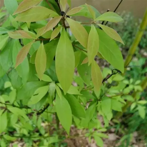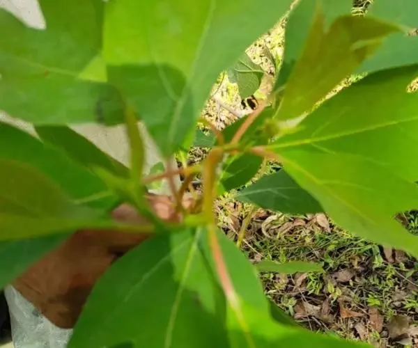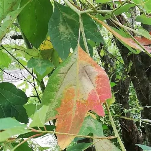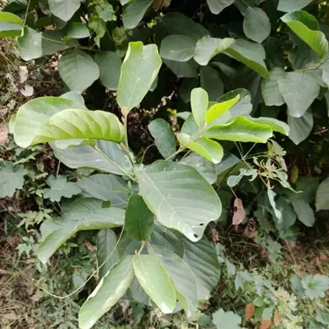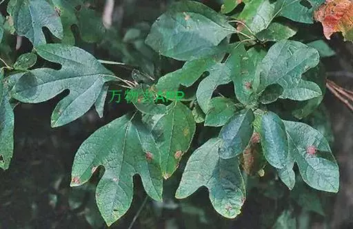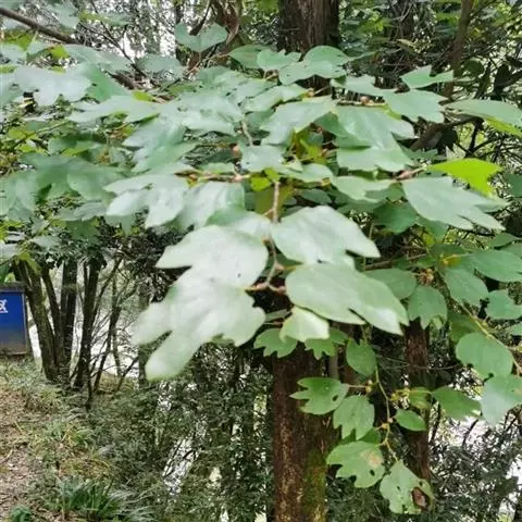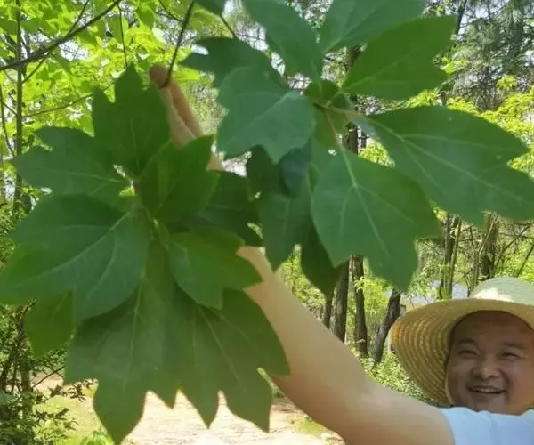 落叶乔木,高可达35米,胸径达2.5米;树皮幼时黄绿色,平滑,老时变灰褐色,呈不规则纵裂。顶芽大,椭圆形,长达1.4厘米,直径0.9厘米,芽鳞近圆形,外面密被黄色绢毛。枝条粗壮,近圆柱形,多少具梭角,无毛,初时带红色,干后变黑色。叶互生,聚集于枝顶,卵形或倒卵形,长9-18厘米,宽6-10厘米,先端渐尖,基部楔形,全缘或浅裂,裂片先端略钝,坚纸质,上面绿色,晦暗或略光亮,下面灰绿色,两面无毛或下面尤其是沿脉网疏被短硬毛,羽状脉或离基三出脉,中脉、侧脉及支脉两面稍明显,最下方一对侧脉对生,十分发达,向叶缘一方生出多数支脉,支脉向叶缘弧状网结;叶柄纤细,长(1)2-7厘米,鲜时常带红色,腹平背凸,无毛或略被短硬毛。