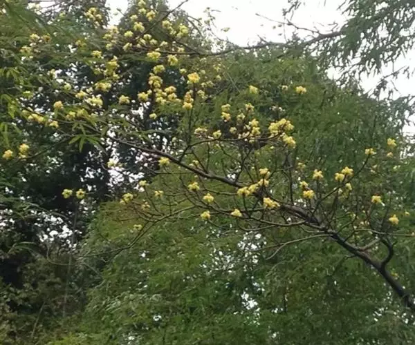 檫木(学名:Sassafras tzumu(Hemsl.) Hemsl)是樟科,檫木属落叶乔木,高可达35米,胸径达2.5米;树皮平滑,顶芽大,椭圆形,芽鳞近圆形,叶片互生,聚集于枝顶,先端渐尖,基部楔形,裂片先端略钝,坚纸质,上面绿色,下面灰绿色,叶柄纤细,花序顶生,先叶开放,多花,与序轴密被棕褐色柔毛,苞片线形至丝状,位于花序最下部者最长。花黄色,雌雄异株;花梗纤细,花被筒极短,花被裂片披针形,花丝扁平,被柔毛,果近球形,果托呈红色。3-4月开花,5-9月结果。
