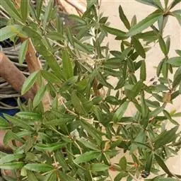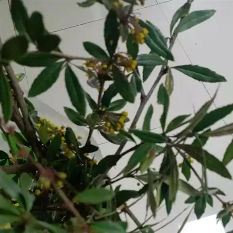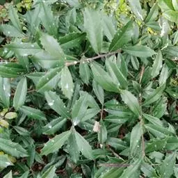 常绿灌木,高约2米。老枝具棱槽,散生黑色疣点;茎刺细弱,三分叉,长7-15毫米,腹面具槽。叶革质,椭圆状倒披针形,长4-9厘米,宽1.5-2.5厘米,先端急尖,具1刺尖,基部楔形,上面栗色,有光泽,中脉和侧脉凹陷,背面棕黄色,中脉和侧脉隆起,两面网脉显著,不被白粉,叶缘平展,有时微向背面反卷,每边具35-60刺齿;叶柄长2-4毫米。