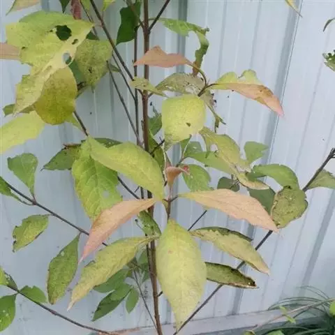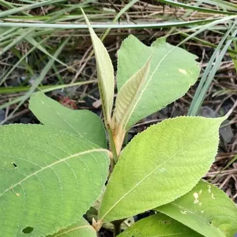 叶膜质,两面具密集的腺点,下面具灰色星状毛,叶片倒披针形或倒卵状长圆形,基部下延成狭楔形,顶端渐尖,上半部有锯齿。