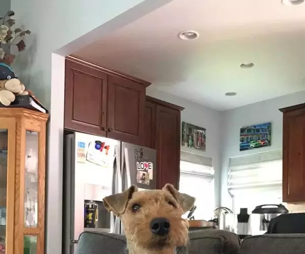【头部】头部呈矩形。眼睛小,深褐色,杏仁形,在颅部位置良好,眼距颇宽。眼睛的大小、形状、色彩肢位置给人稳重、自信、机警的表情,这是威尔士梗具有的典型特征。