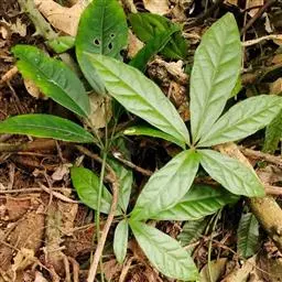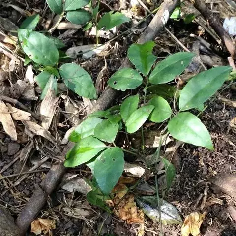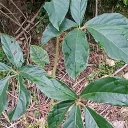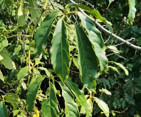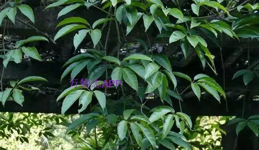 木质大藤本,茎扁压,深褐色。小枝圆柱形或微扁,有纵棱纹,无毛。卷须不分枝, 相隔2节间断与叶对生。叶为掌状5小叶,小叶长圆披针形、披针形、卵披针形,长(6) 9-16厘米,宽(2.5) 3-6 (7)厘米,顶端渐尖或急尖,基部楔形,边缘每侧有5-9个锯齿,锯齿不明显或细小,稀较粗,上面绿色,下面浅绿色,两面无毛;侧脉5-6对,网脉突出;叶柄长3-11厘米,无毛,小叶柄长0.5-3厘米,中央小叶柄比侧生小叶柄长2-4倍,无毛。