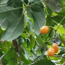 扁担藤为热带雨林中为数不多的具有老茎开花、老茎结果现象的藤本植物之一,它的花果都仅仅出现在较粗壮的藤茎基部,甚至贴地而生。它的花十分细小,但数量极多,呈淡紫色,密密麻麻,成丛成簇,它的果实大小如鸽卵,圆球形,串状或团状,果实幼嫩时绿色,较酸,成熟时棕红色,变软,汁多微甜可食用。