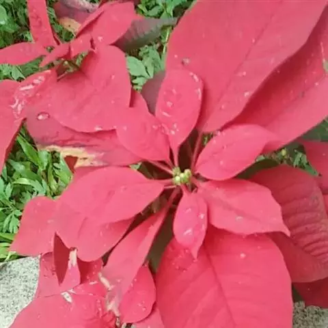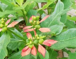 花序2. 4或8个组成二歧状复花序,生于枝上部叶腋;复序具柄,长4-7厘米;每个花序基部具6-10毫米长的柄,柄基部具1枚膜质苞片,长1-3毫米,宽1-2毫米,上部近平截,边缘具微小的红色尖头;苞叶2枚,肾圆形,长8-10毫米,宽12-14毫米,先端圆且具小尖头,其部渐狭,无柄,上面鲜红色,下面淡红色,紧贴花序;总苞钟状,高3-4毫米,直径3.5-4.0 毫米,边缘5裂,裂片琴形,上部具流苏状长毛,且内弯;腺体5枚,肾圆形,长约1毫米,宽约2毫米,黄红色。雄花数枚;苞片丝状,先端具柔毛;雌花1枚,常不伸出总苞外;子房光滑无毛,常包于总苞内;花柱3,中部以下合生;柱头2裂。