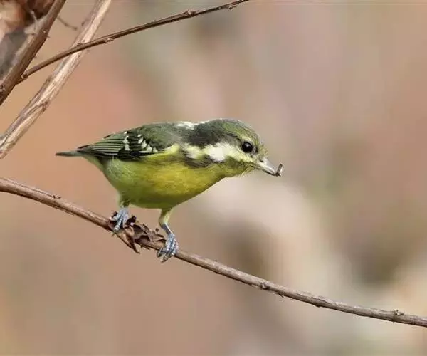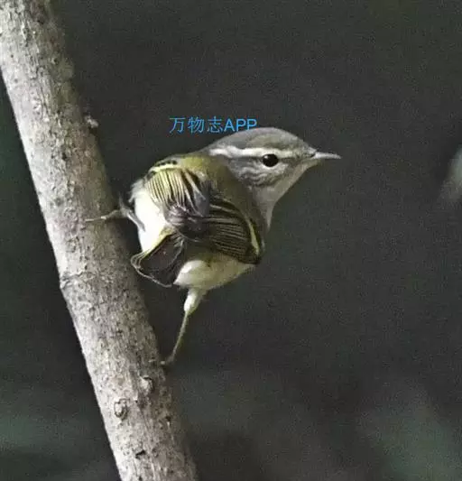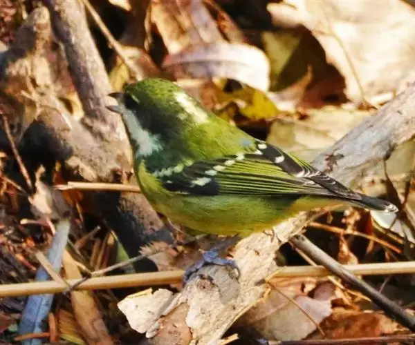 雌鸟额、眼先、头顶、枕和背灰绿色,后颈有一淡黄色斑。腰亦为灰绿色但稍淡,两翅覆羽和飞羽黑褐色,外翈羽缘绿色,中覆羽、大覆羽和三级飞羽具淡黄白色端斑。脸颊、耳羽以及颏和喉白色或灰白色,其余下体淡黄沾绿色。