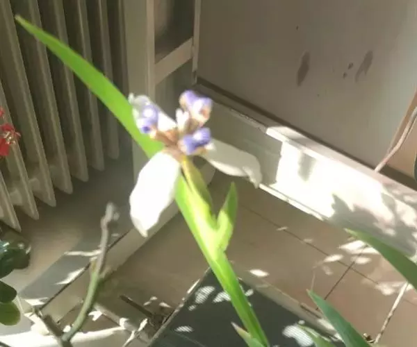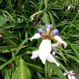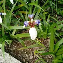 巴西鸢尾株高约40~50公分,叶从基部根茎处抽出,呈扇形排列。叶宽约2公分,革质,深绿色;花期约春至夏 巴西鸢尾 季,花茎扁平似叶状,但中肋较明显突出,花从花茎顶端鞘状苞片内开出,花有6瓣,3瓣外翻的白色苞片,基部有红褐色斑块,另3瓣直立内卷,为蓝紫色并有白色线条。花通常上午开放,至下午3~4点就开始内卷枯萎了,但花鞘内的花开完後,会长出小苗,小苗越长越大最後降至土表,发根成苗,而小苗隔年就有开花能力。 巴西鸢尾的繁殖方式很奇特,像吊兰一样,在开花后会从花鞘内长出小苗。