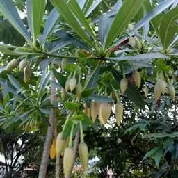多年生木本植物,初夏与冬季开花,花米黄色或黄色,吊钟花型,花瓣花蕊风干后成棕色,有芳香味。果实如榄,果皮有细毛。 杜英