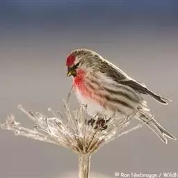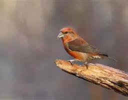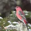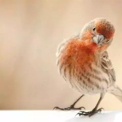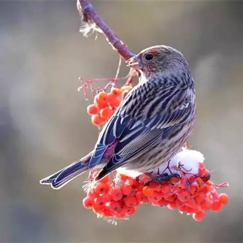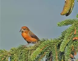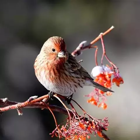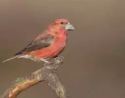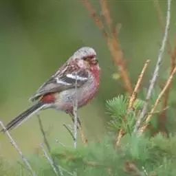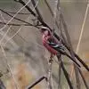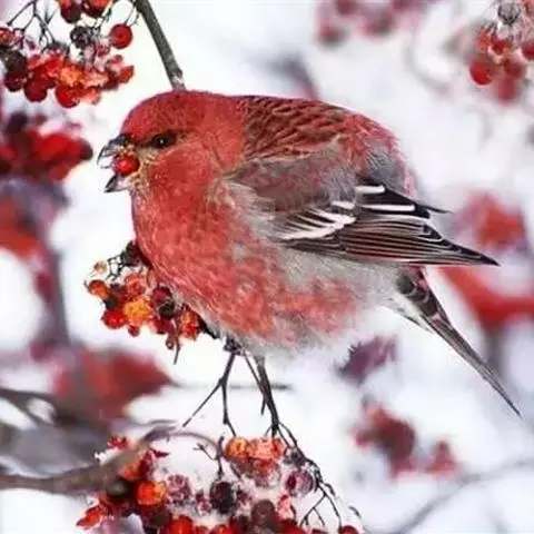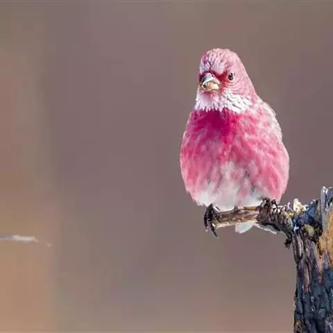 红腰朱雀:体长12-14厘米,小型鸟类。雄鸟前额和眉纹玫瑰粉红色,头顶和一宽的贯眼带深红褐色,背红…