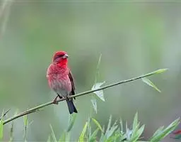 长尾朱雀:体长18厘米,体重16-26克。雄鸟额、颏和眼后为暗红色,…