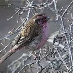 粉红腹岭雀:为燕雀科岭雀属的鸟类。体重25-34克,体长150-182毫米。是一种中等体型的深色岭雀。…