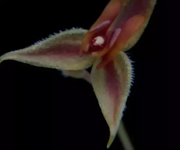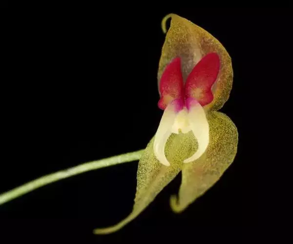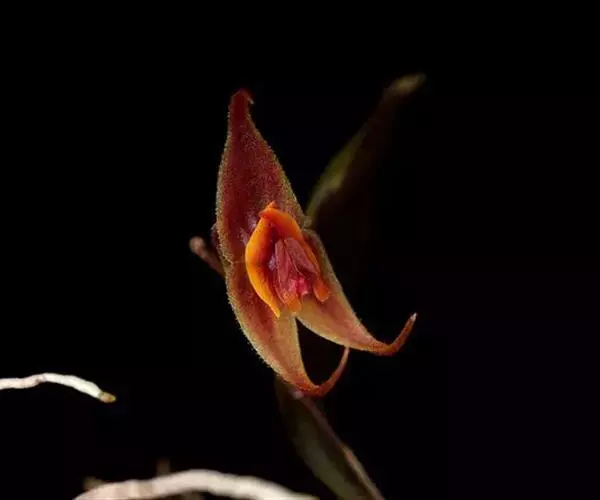 花葶从假鳞茎基部发出,纤细,直立,光滑无毛,高出叶外;总状花序缩短呈伞状,常具2-6朵花;花序柄粗约0.5毫米,疏生2-3枚筒状鞘;花苞片直立,狭披针形,比花梗连同子房短,长2-3.5毫米,先端渐尖;花膜质,白色带紫;中萼片卵状披针形,凹的,长4-5毫米,基部上方宽1.5-2毫米,中部以上骤然变狭并且增厚,先端急尖,边缘具细齿,具3条脉;侧萼片斜卵状披针形,长5-5.5毫米,与中萼片近等宽,中部以上增厚,向先端骤狭呈尾状,基部贴生在蕊柱足上而形成兜状的萼囊,边缘全缘,具3条脉。