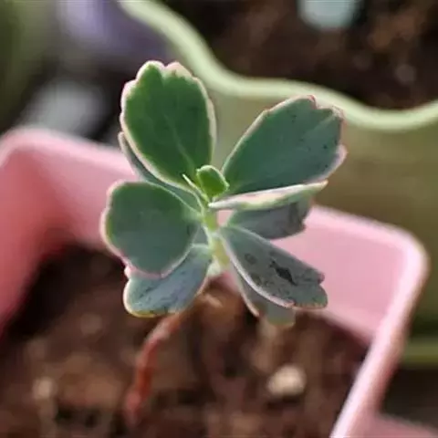 大叶落地生根育苗用土常用腐叶土、粗砂混合。大叶落地生根的人工繁殖可用扦插或栽培不定芽繁殖,叶插、茎插均可,但使用最方便的是不定芽繁殖。大叶落地生根的叶片与其它双子叶植物相比较有着特殊的功能,表现在每个叶缘凹陷处的复表皮里面都有一个不定芽。将大叶落地生根的母株置于空气湿度较大的温室内,可促进不定芽生长,1枚叶能长出30-50个不定芽。不定芽刚长出1根不定根时即从叶片上取下该成熟的不定芽,均匀播在育苗盘内,营养土一定要使用消毒后的干浄土壤,并疏松透气;将育苗盘放在阳光充足的温室内,切忌弱光,否则幼苗细弱而徒长。当幼苗长到4-6片叶时,分苗至50孔的穴盘中,封行后移栽到直径15厘米或18厘米盆中。益阳多在春末进行繁殖也可在秋季繁殖。幼苗繁殖尽量避开盛夏和严冬。